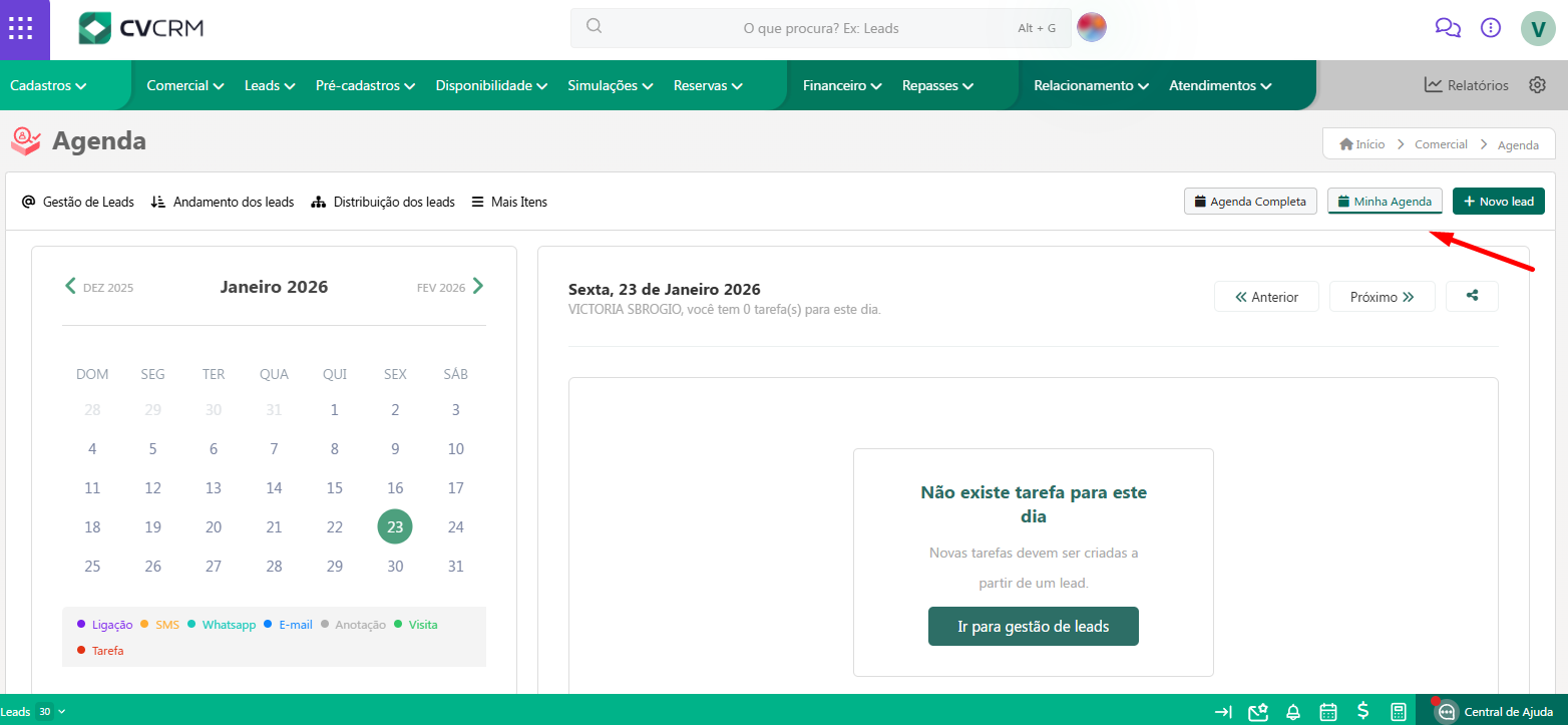 Já em "Minha Agenda", você irá visualizar apenas as próprias tarefas. Quando há uma tarefa agendada para o dia, fica uma bolinha marcada abaixo da data. Além disso, cada interação tem uma cor diferente.