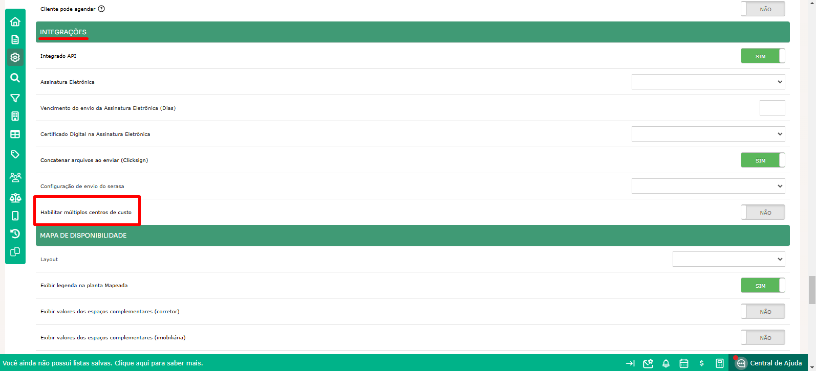 - Localize a opção Habilitar múltiplos centros de custo e altere o status para SIM.
