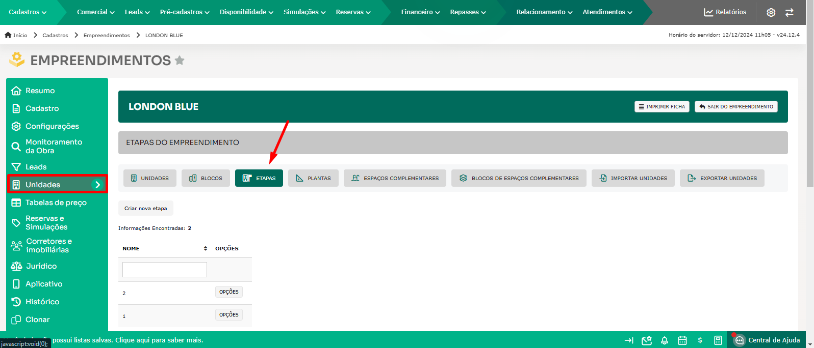 - Na aba lateral Unidades, localize a seção Etapas.