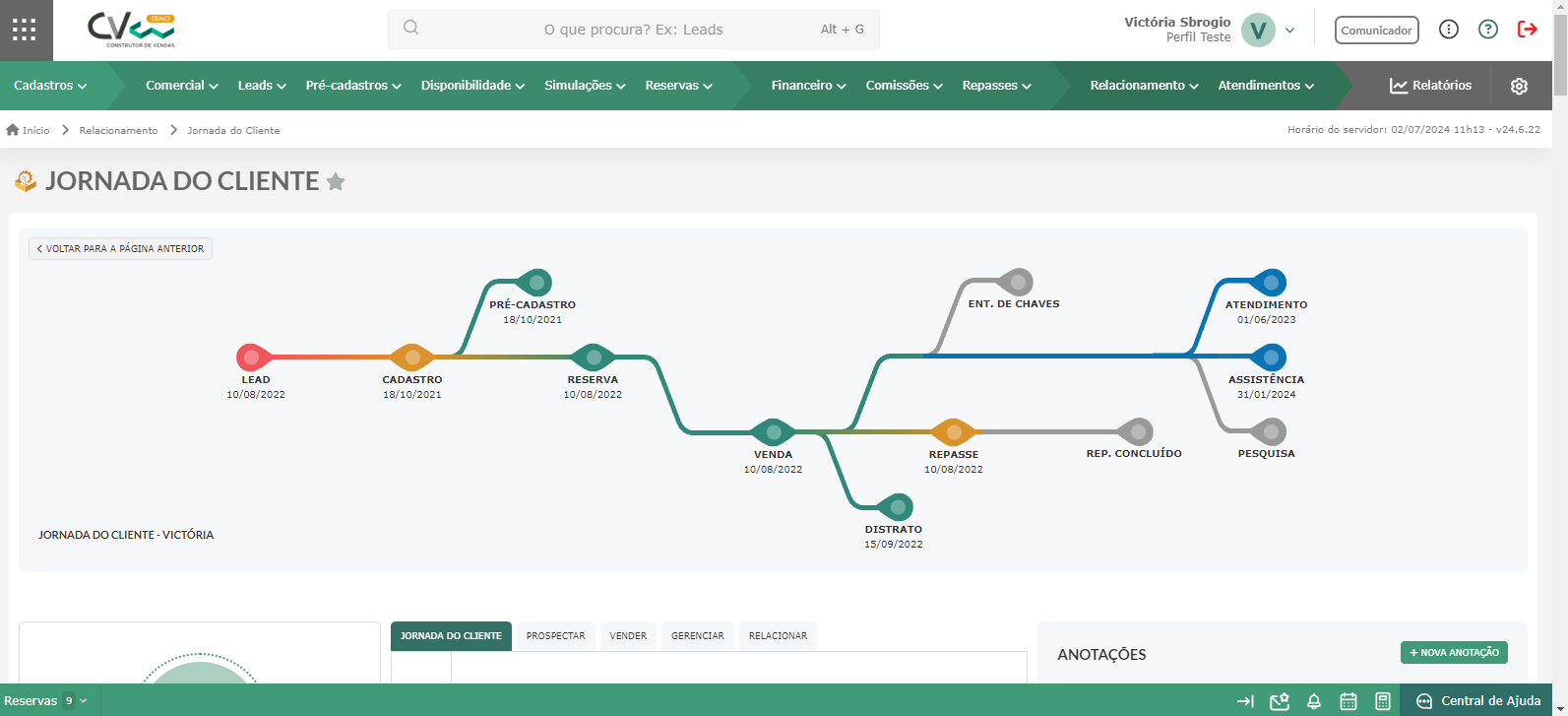 A jornada do cliente serve para visualizar e analisar todas as etapas pelas quais o cliente passou ao longo de sua trajetória. Isso inclui o mapeamento de informações desde o momento em que o cliente se tornou lead, passando pelo pré-cadastro, atendimentos, entre outros.