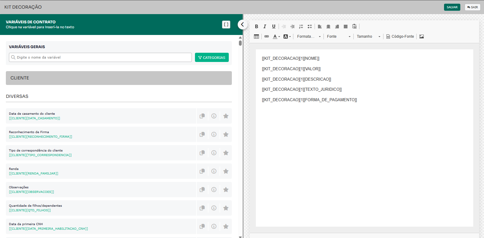 O sistema gera variáveis para que as informações do kit apareçam automaticamente no contrato: