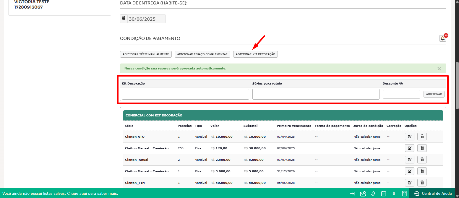 - Nova reserva: após selecionar uma tabela, na área de Condição de Pagamento, você irá visualizar o botão "Adicionar Kit Decoração". Selecione o kit, a série para rateio e o desconto % (se houver). Caso você não selecione uma série para rateio, o valor será distribuído em todas as séries dessa condição de pagamento.