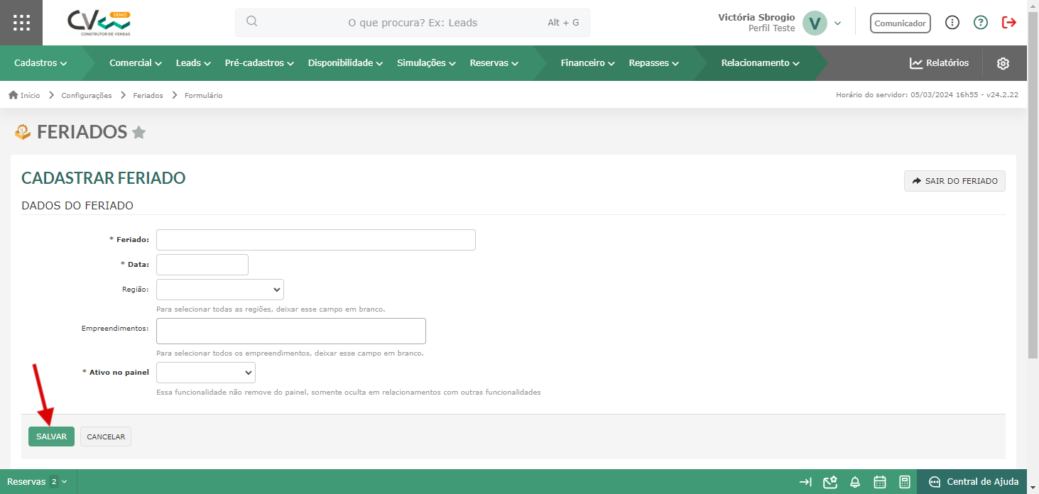 Passo a passo para cadastrar um feriado