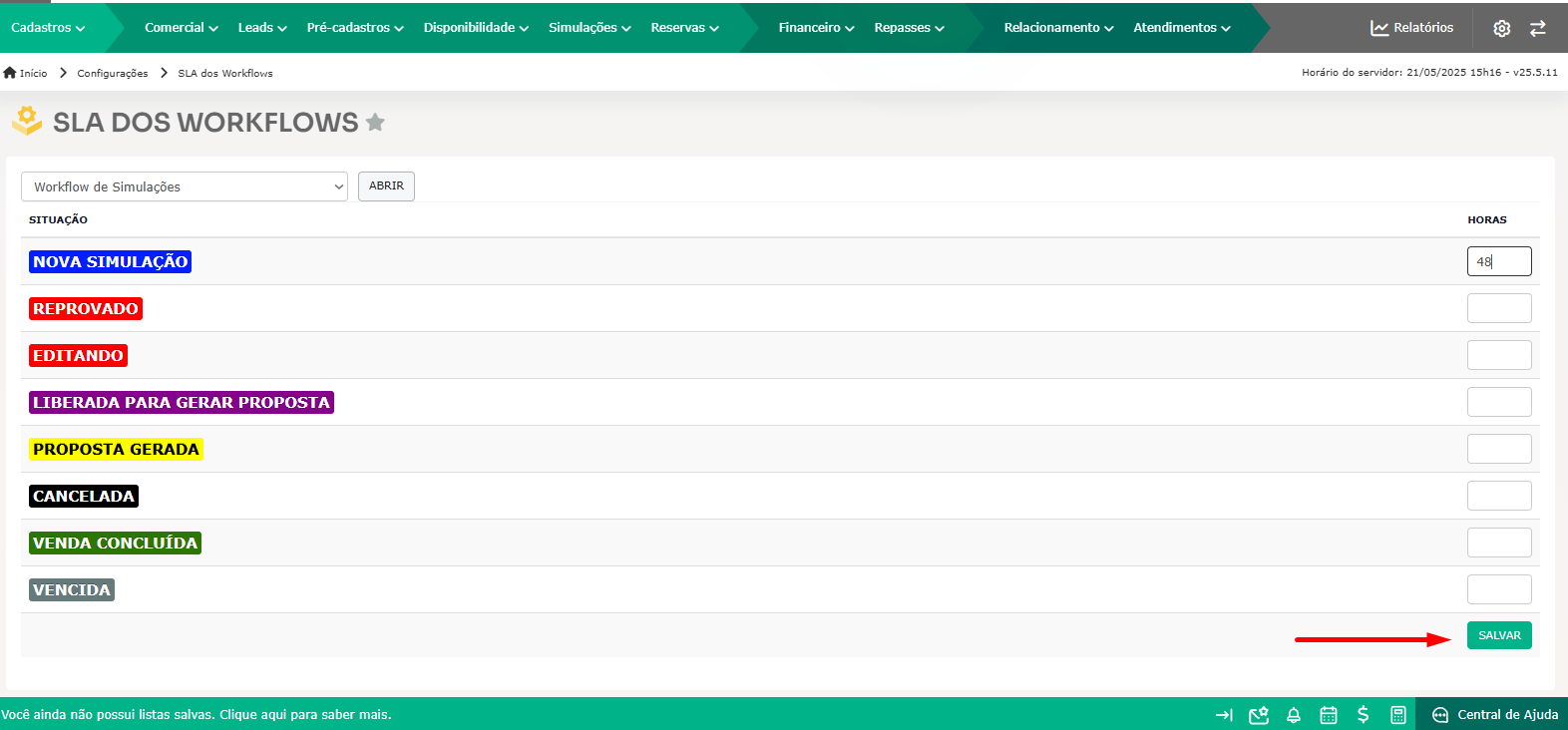 Exemplo: A situação “Novo Simulação” pode ter um SLA de 48 horas, ou seja, se não houver movimentação dessa situação em até 48 horas, ela será considerada vencida.