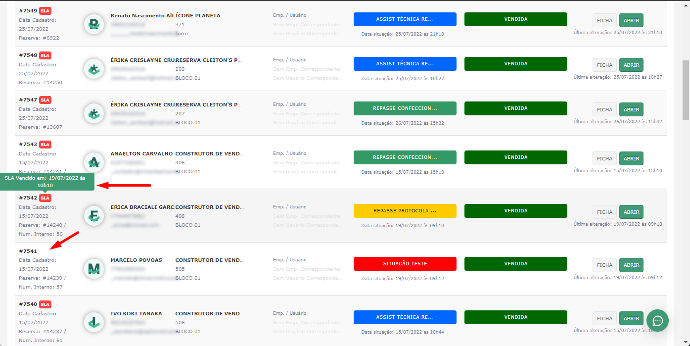 Quando o prazo definido no SLA vence, o sistema exibe automaticamente uma tag “SLA” na listagem da funcionalidade correspondente.