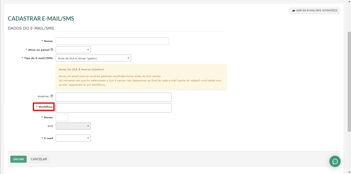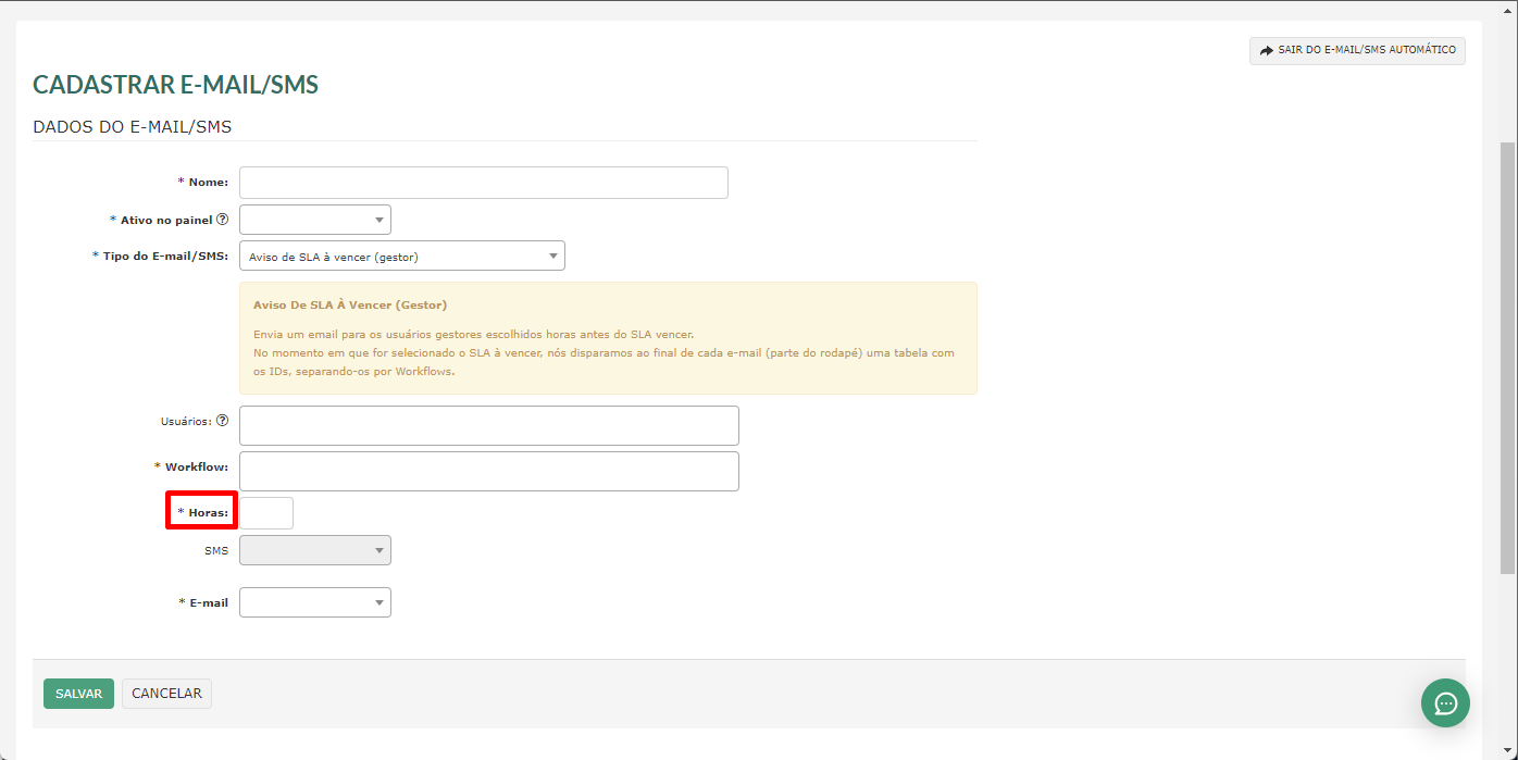 No campo “Tipo do E-mail/SMS”, selecione a opção: “Aviso de SLA a vencer (gestor)”.