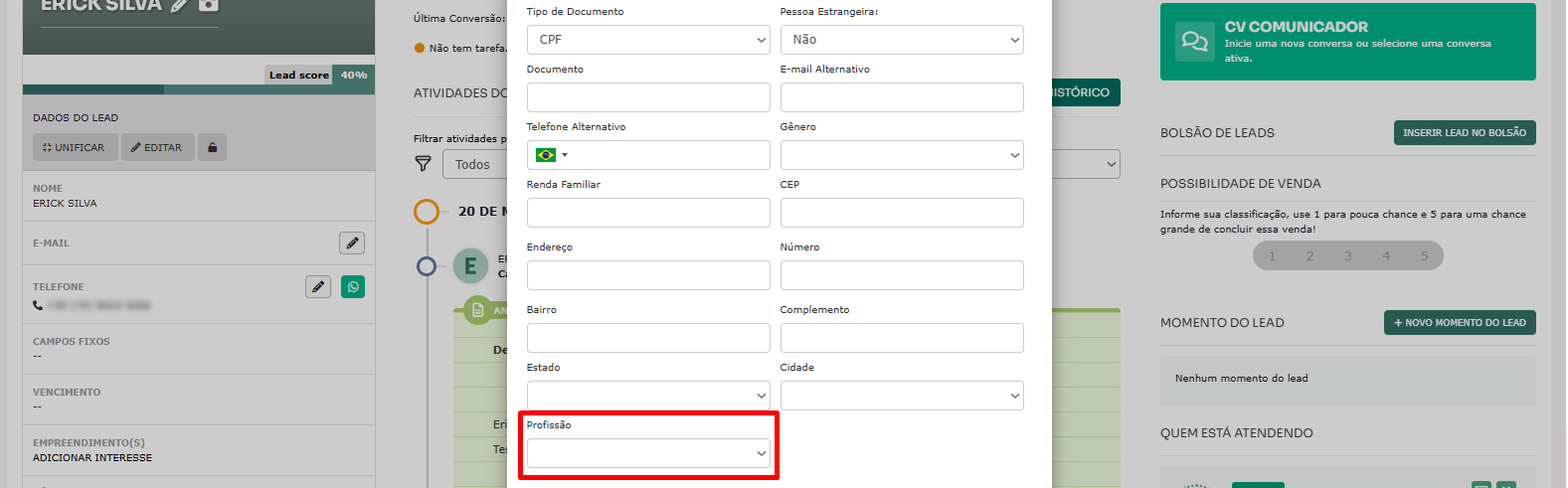 • O campo Profissão aparecerá na ficha cadastral, utilizando as opções disponíveis no cadastro de profissões.