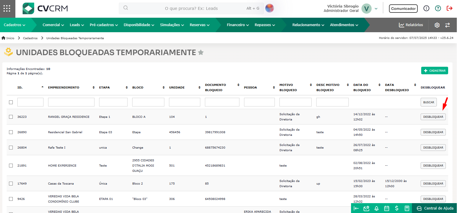 Se você tiver a permissão “Remover Bloqueio”, poderá realizar o desbloqueio diretamente pela listagem: