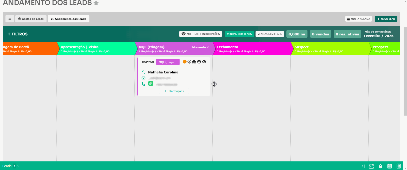 O Andamento dos Leads oferece uma visualização dinâmica e estruturada dos leads, permitindo um acompanhamento mais intuitivo. Os leads são exibidos em colunas organizadas em formato de pipeline, onde cada coluna representa uma situação específica do workflow.