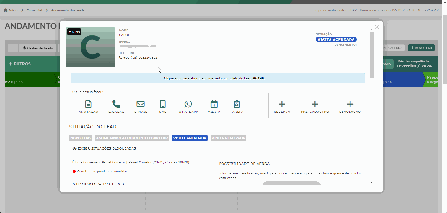 Para uma melhor visualização dessa página, é possível clicar em “Clique aqui” para abrir o administrar completo do lead.