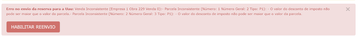 [UAU] Erro: Venda Inconsistente (Empresa 1, Obra 29): Parcela Inconsistente (Número 1, Grelha 2, Tipo P1) – Valor do desconto de imposto