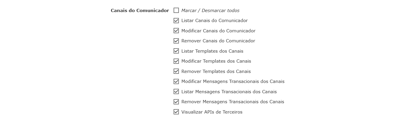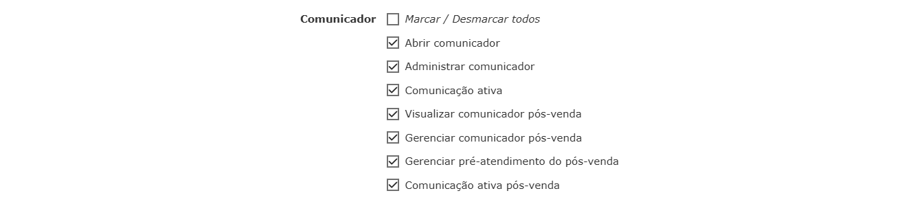 Com as liberações feitas pelo time do CV, o próximo passo é garantir que os usuários tenham acesso às funcionalidades do Comunicador, liberando as permissão do perfil de acesso: