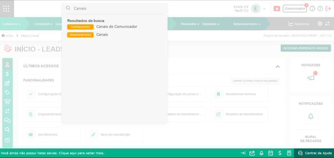 Após a liberação do Comunicador na base, o próximo passo é o cadastro de um novo canal.