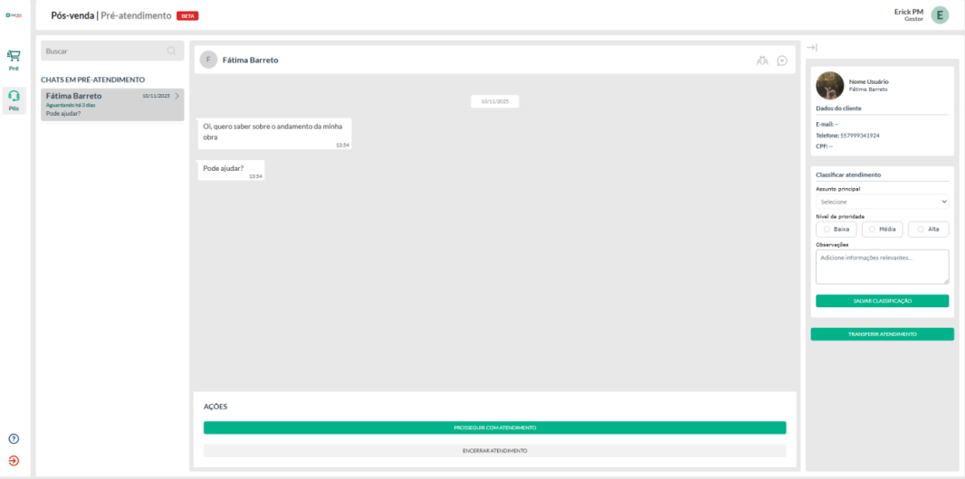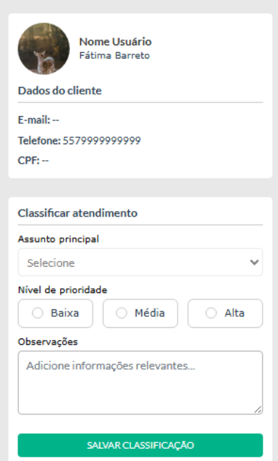 O sistema realiza uma validação automática do número de telefone do cliente. Se o número já estiver vinculado a um cadastro existente, o atendimento é imediatamente associado a esse cliente.
