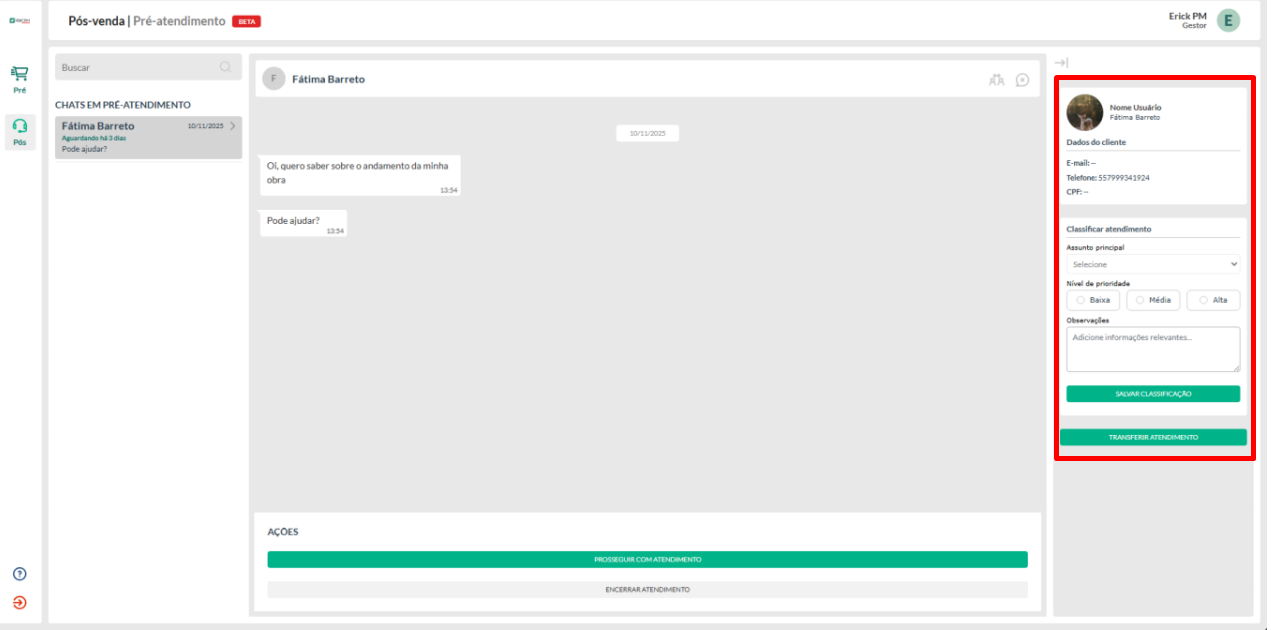 Transferir Atendimento: Permite que o responsável pelo pré-atendimento encaminhe a solicitação para outro atendente ou equipe específica, garantindo uma distribuição precisa e organizada das demandas entre as áreas internas da empresa.