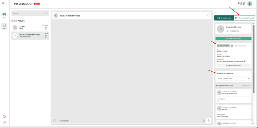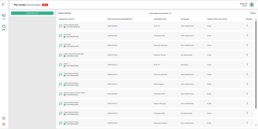 Assim como no módulo de Pré-Vendas, o Gerenciador de Atendimentos do Pós-Venda fornece uma visão macro de todas as interações em andamento.
