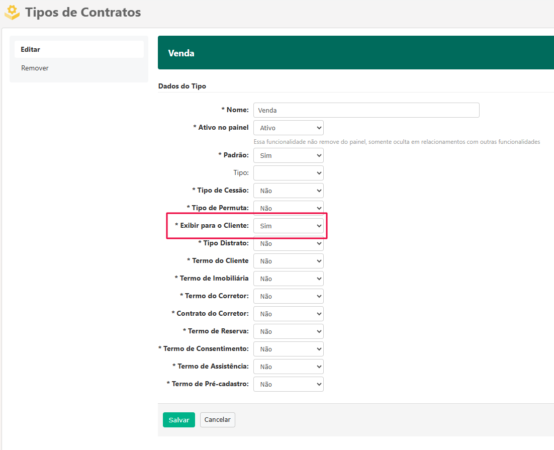 - No cadastro dos tipos de contratos, confirme que a opção para exibição ao cliente está habilitada. Se essa configuração não estiver correta, o contrato não aparecerá no portal, mesmo que todos os outros requisitos estejam atendidos.