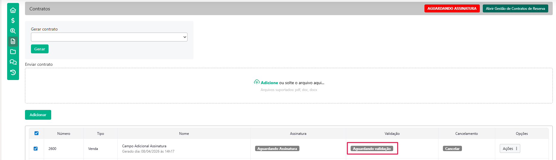 4° Os Contratos gerados na Reserva precisam estar marcado como Validado. Para a validação, o Financeiro da Reserva precisa ter sido aprovado