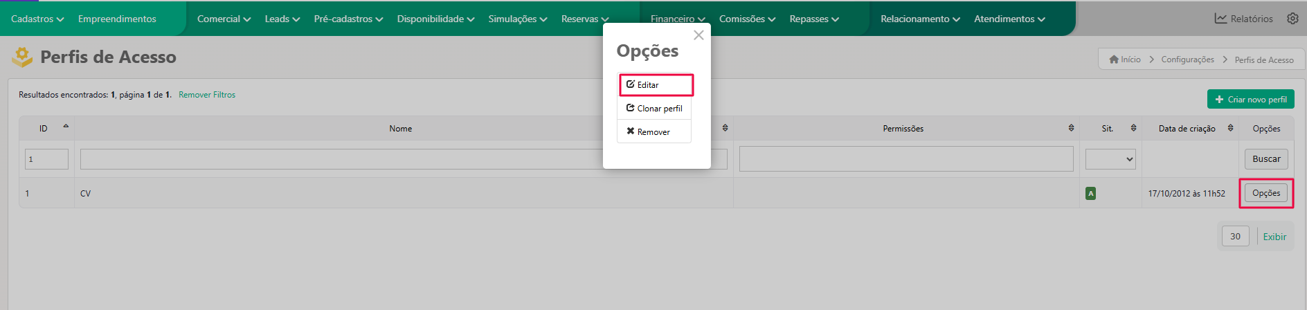 - Acesse o Perfil em que essa ação será liberada e clique em Opções -> Editar