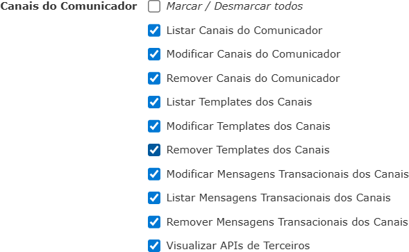 Na aba Configurações, localize o item chamado Canais do Comunicador e libere todos os itens.