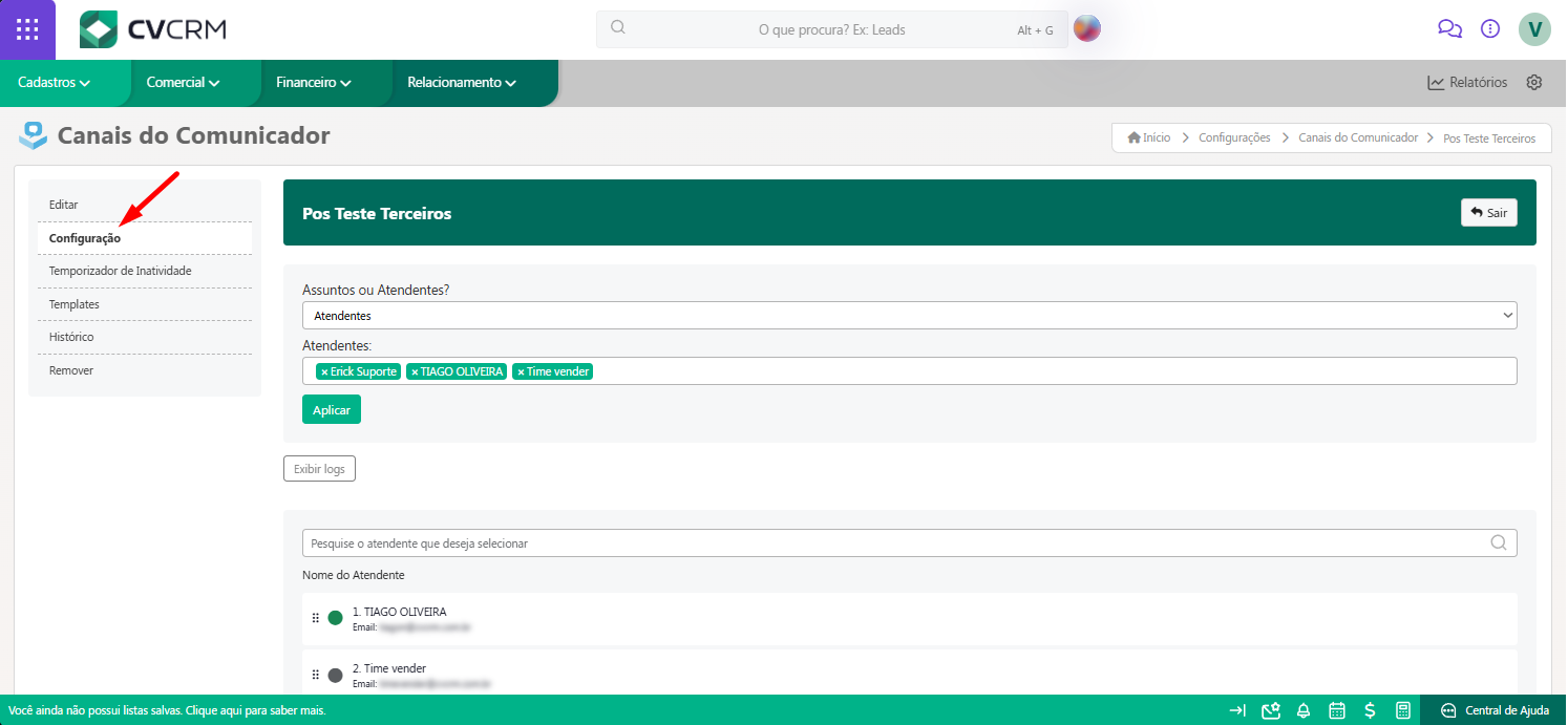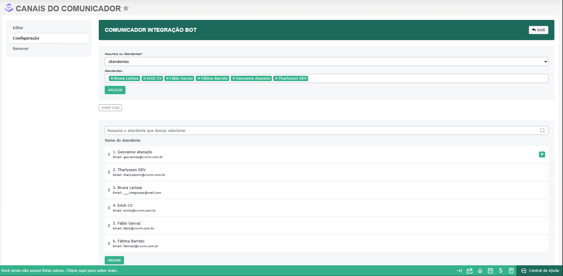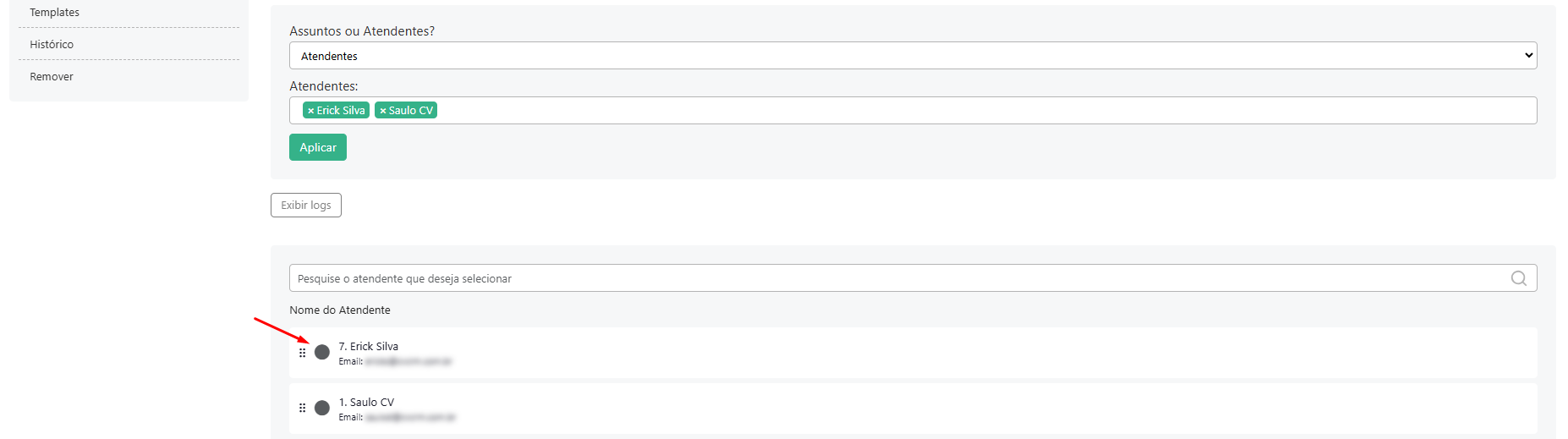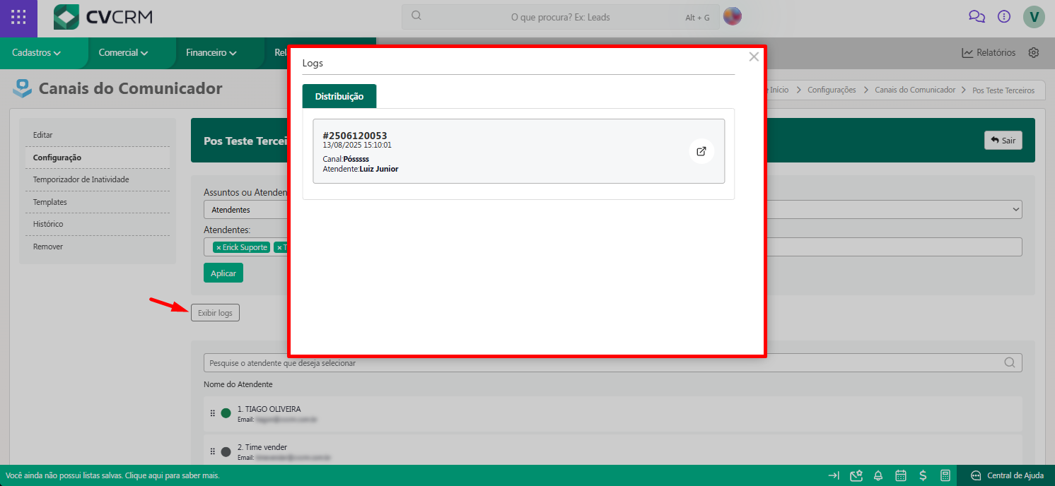 Após configurar o tipo de distribuição, você pode acompanhar o registro dos atendimentos realizados clicando no botão Exibir Logs.