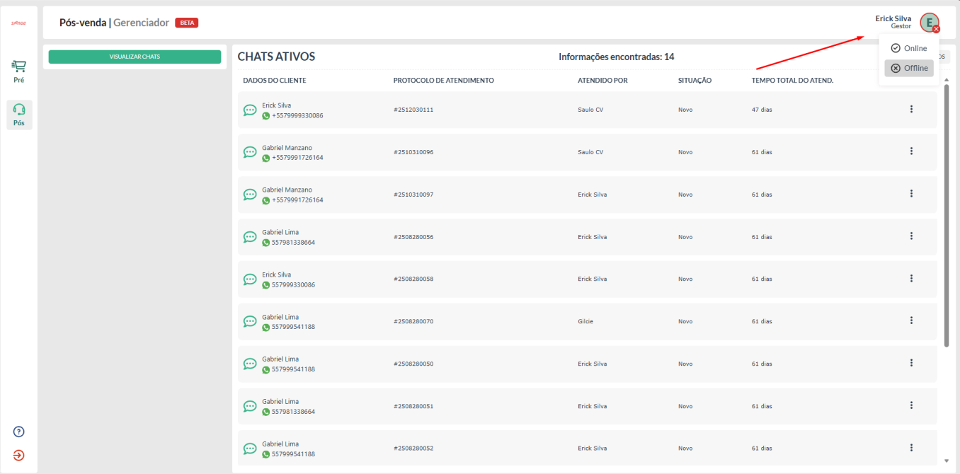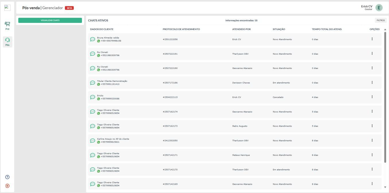 Assim como no Pré-Vendas, o Gerenciador também oferece uma visão macro de todos os atendimentos em andamento. Com isso, os gestores podem acompanhar as interações em tempo real, visualizar o conteúdo das conversas, trocar atendentes.
