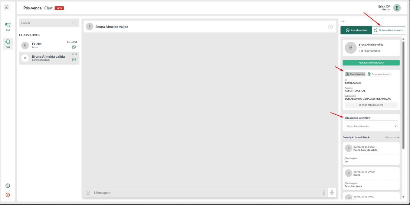 Na visão dos chats, assim como no Pré-Vendas, há uma SideBar que fornece informações rápidas ao atendente, como os dados do atendimento em andamento e o histórico de atendimentos anteriores com o mesmo cliente.