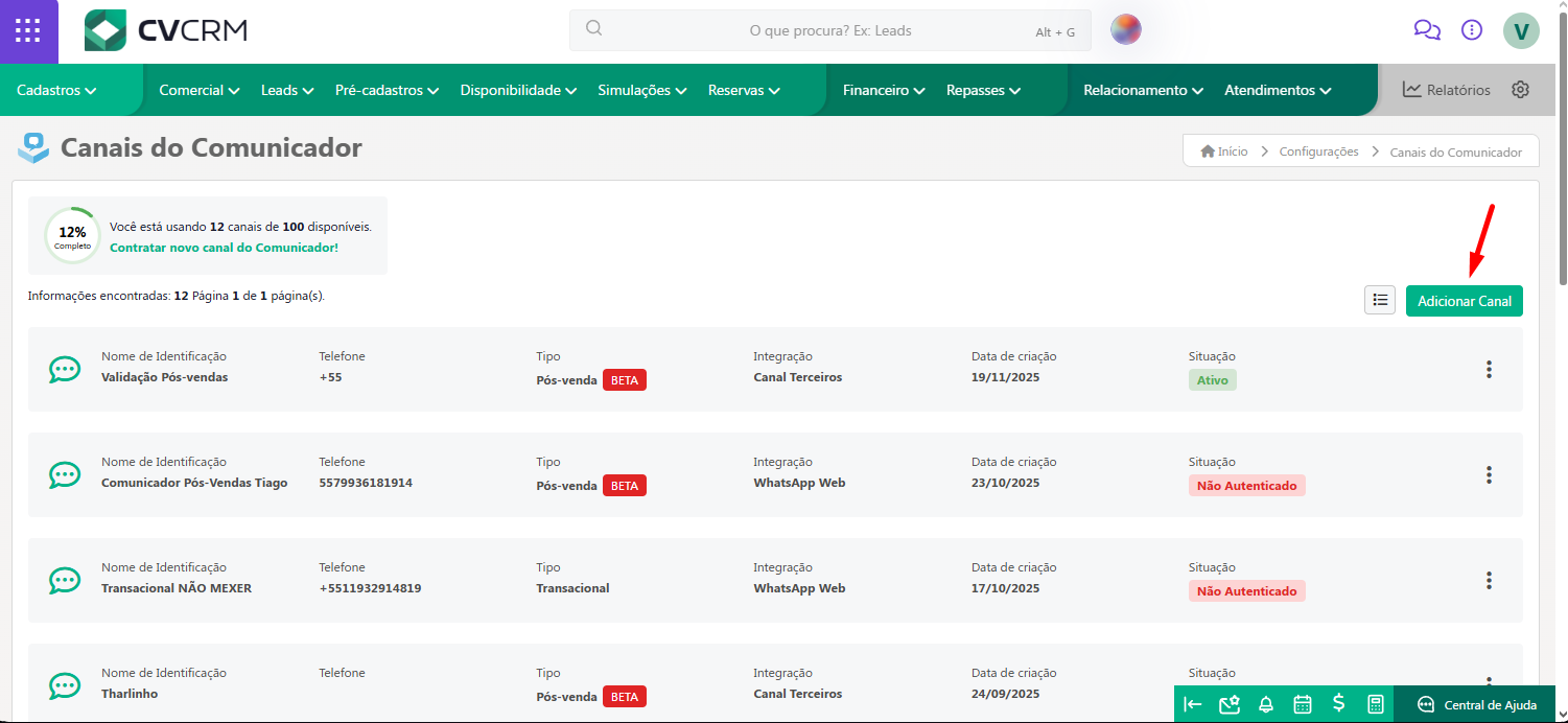 Em seguida, clique em Adicionar Canal e preencha o formulário com as informações necessárias para configurar o novo canal de atendimento.