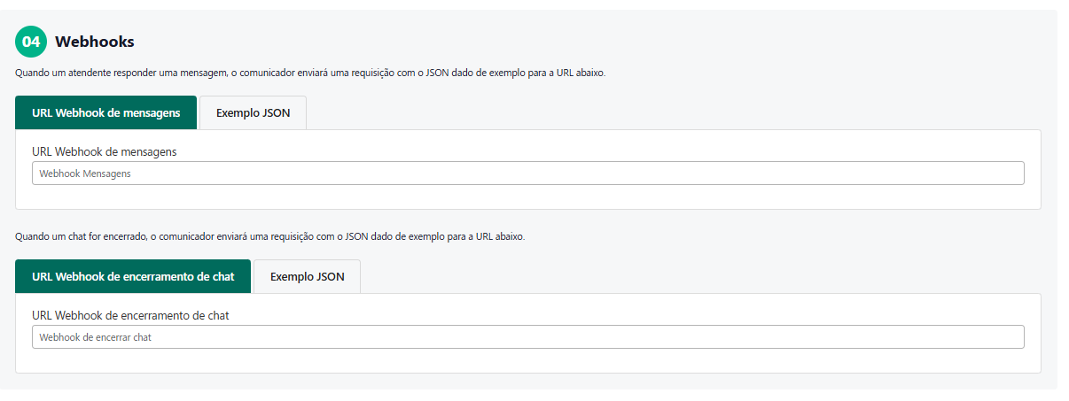 - Webhooks: Um deles é acionado sempre que uma nova mensagem é enviada no Comunicador, notificando o integrador em tempo real. O outro é disparado no momento em que o chat é encerrado, informando o integrador sobre o fim da conversa.