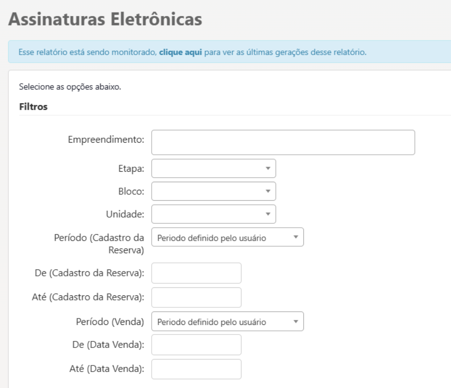 O relatório Assinaturas Eletrônicas permite acompanhar todo o processo de assinatura digital relacionado às reservas no CV CRM.