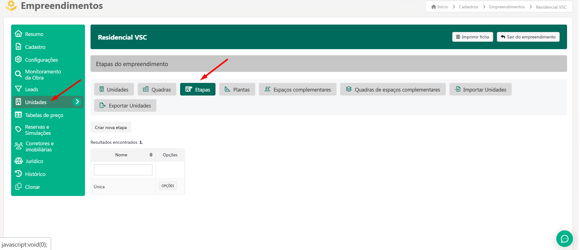 - Na aba lateral Unidades, localize a seção Etapas.