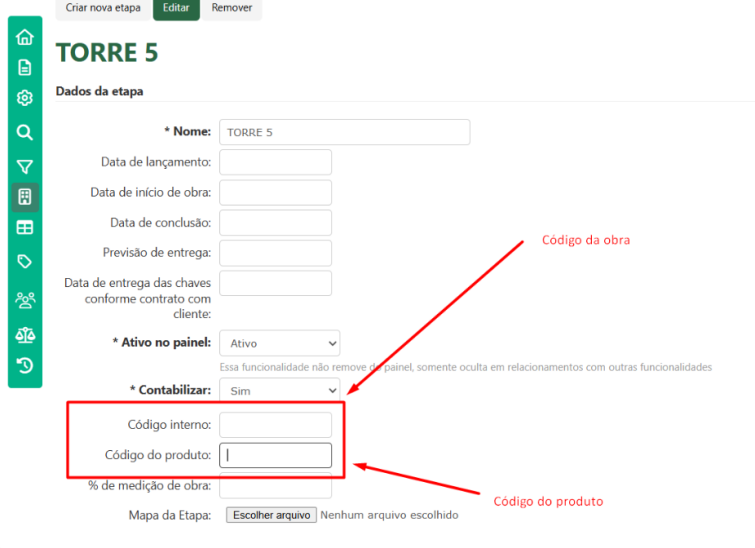 - Insira o código da obra no campo “Código Interno” e o código do produto no campo “Código do produto”.